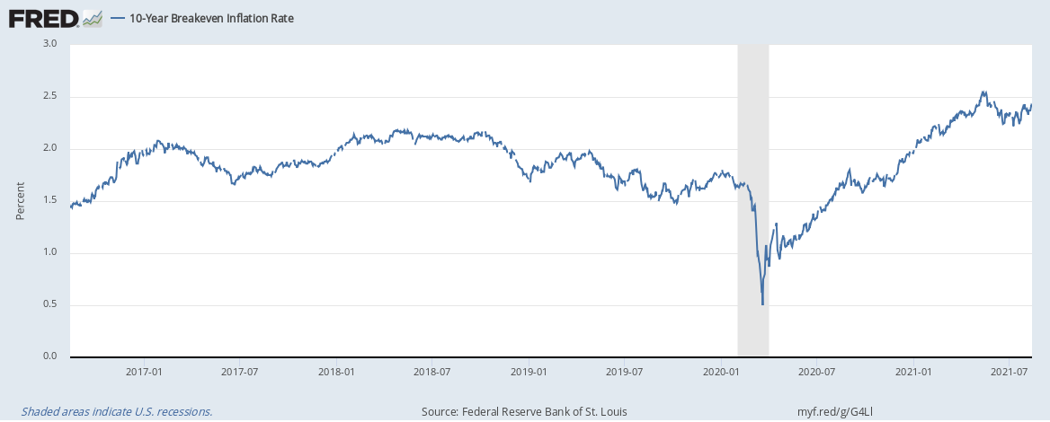 As of today (August 12, 2021), that market derived inflation expectation rate is 2.41%, according to Federal Reserve Economic Data.