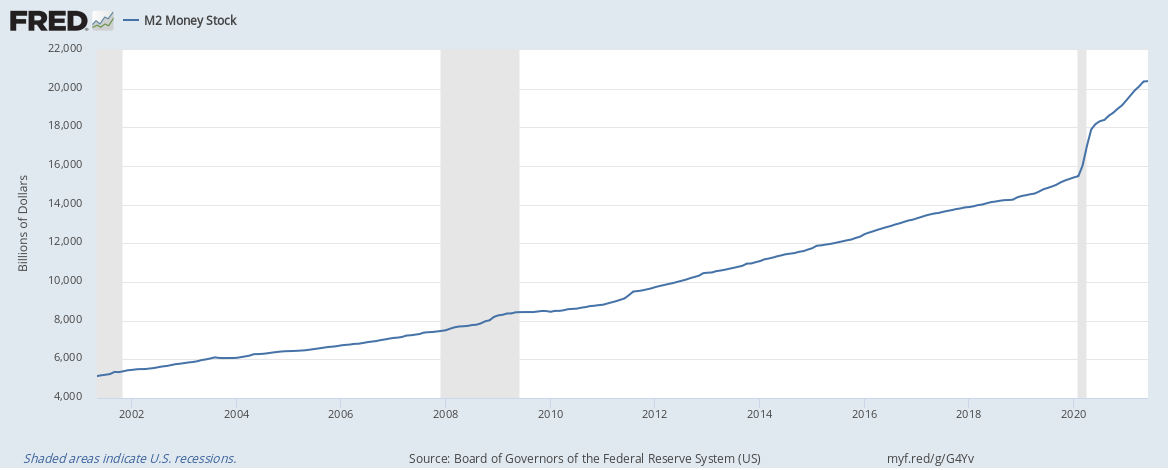 Honestly though, this shouldn’t be a surprise. We’ve been going through an unprecedented monetary experiment since the 2008 crisis and quantitative easing, and we only stepped on the gas even harder in March 2020 with COVID. Below is the M2 Money Supply of US Dollars, from Federal Reserve Economic Data: